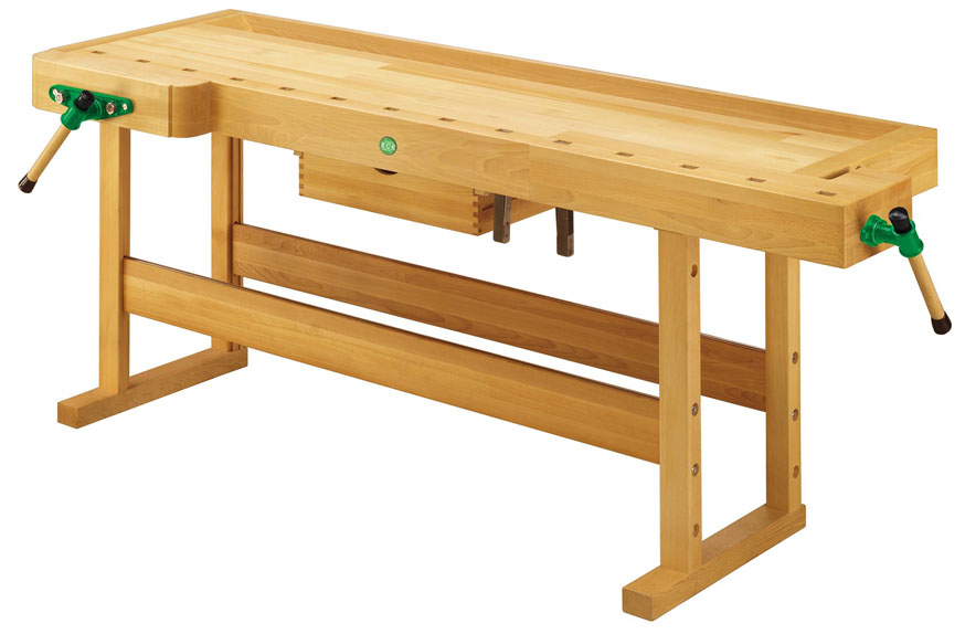 E.C.E Hobelbank in schwere Ausführung: Platte, Untergestell, Stirnhölzer aus massivem Rotbuchenholz, Platte zahnverleimt, gewachst und poliert Französische Vorderzange mit seitenstabilen Flacheisenführungen, die auch bei starker einseitiger Belastung gleichmäßigen Druck auf der gesamten Zangenbreite ausübt. Spannweite: Vorderzange 215 mm, Hinterzange 240 mm Deutsche Hinterzange mit nachstellbarer Kastenführung Schubkasten mit Auszugsicherung Komplett mit Bankhaken und Zangenschlüssel