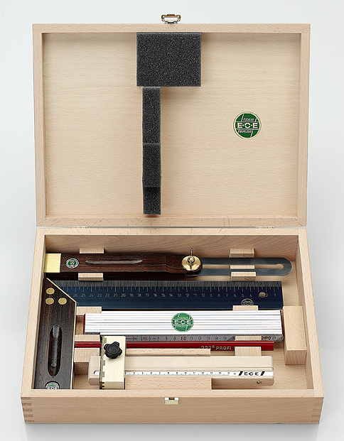Werkzeugset "Messen und Anreißen" Das attraktive Set besteht aus hochwertigen und präzisen E.C.E.-Werkzeugen in praktischer Holzbox. Inhalt: 1 Präzisions-Schmiege 300 mm 1 Präzisions-Winkel mit Gehrung 300 mm 1 Bleistift ,oval 240 mm 1 Holzgliedermeßstab 2000 mm 1 Streichmaß mit Pockholzauflage VPE:1 Set |